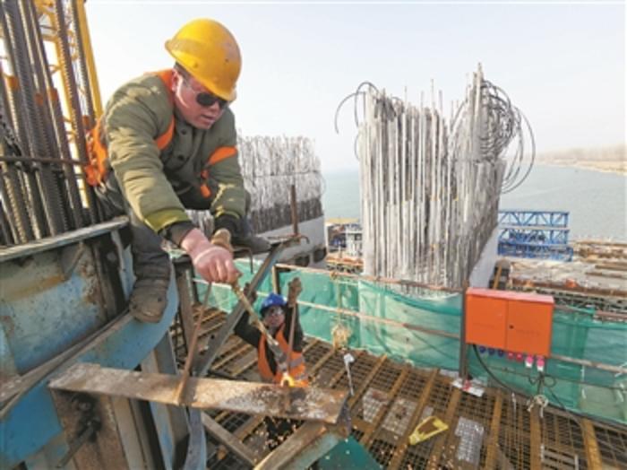 1月1日,中建三局二公司基础设施公司工人翟龙生在安徽蚌五高速淮河大桥建设工地施工。 夏炜 摄