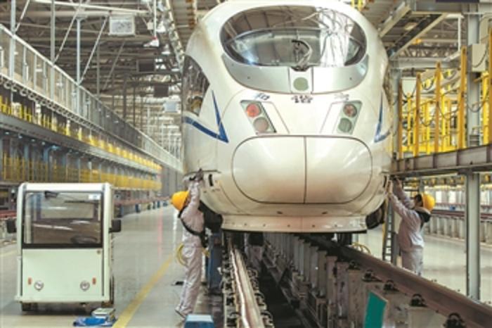 1月1日,中国铁路西安局集团有限公司西安动车段检修库内,动车组机械师在对动车车下部件进行检查。
