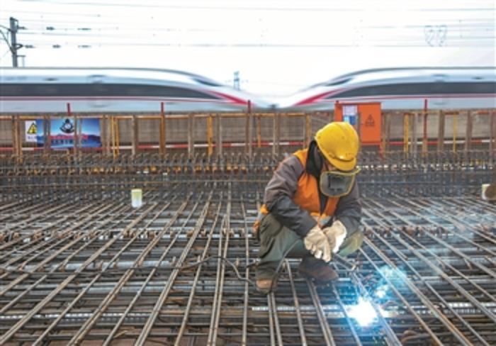 1月1日,中铁四局引江济淮沪蓉改建02标项目经理部施工现场,工人正在进行焊接作业,身后复兴号高铁快速奔驰。