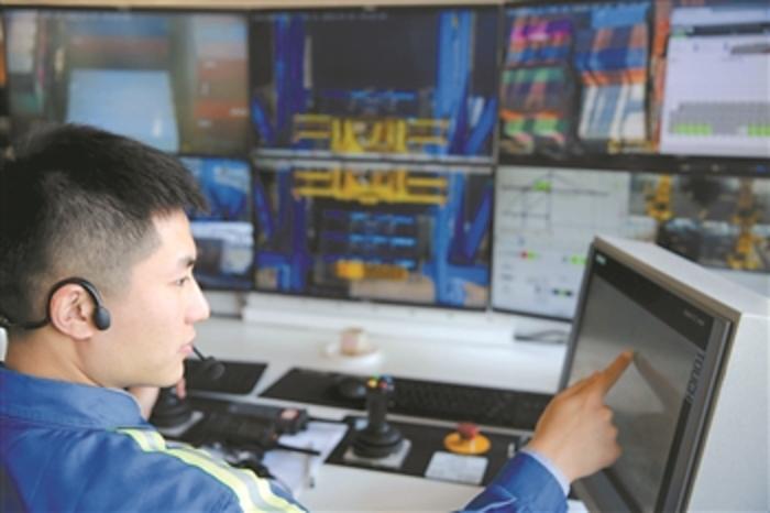 1月1日,在青岛港全自动化码头生产控制中心,工人姜世栋在监控现场作业情况。