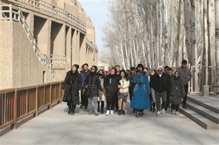 1月1日,敦煌当日气温零下13摄氏度。敦煌研究院接待部讲解员白丽为游客讲解莫高窟的历史。