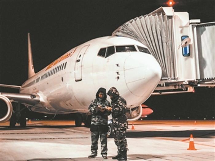 1月1日凌晨,南通兴东国际机场新年第一架飞机监护岗交接,操作员靠桥操作检查。秦培源 摄