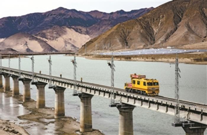1月1日,西藏自治区山南市,中铁电气化局集团西安电化公司施工人员正在雅鲁藏布江明泽特大桥上进行电气化施工。拉林(拉萨至林芝)铁路全长435.48公里,设计时速160公里,是西藏首条电气化铁路。