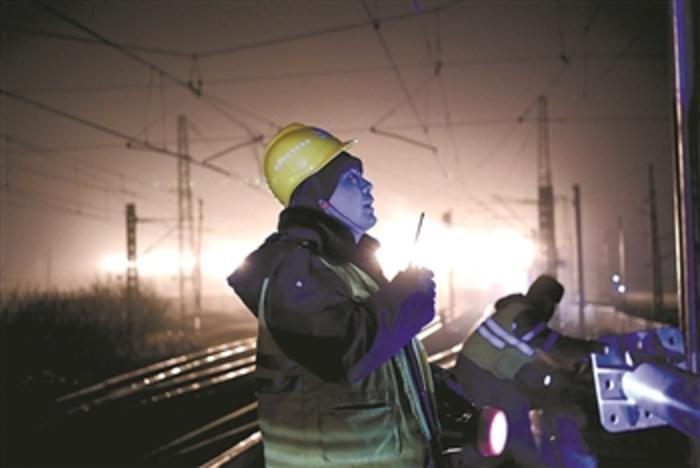 1月1日凌晨,在京哈铁路电气化大修工程滦县站,中铁电气化局的员工在严寒中进行安装作业。赵萌 摄