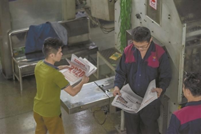 1月1日凌晨2时许,海南日报报业集团印刷厂,工作人员对刚印刷出来打包好的报纸进行抽样检查。袁琛 摄