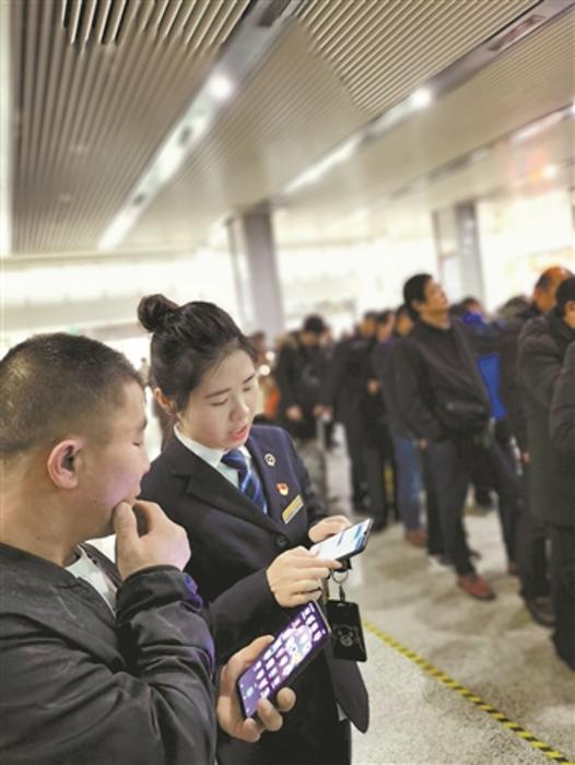 1月1日,无锡火车站工作人员正在为旅客推荐和操作完成候补购票新业务。王春夏 摄