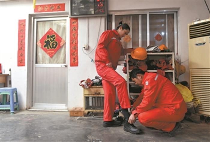 1月1日上午,胜利油田营8更9采油站驻井房,薛梅(图左)因前几天在下雨后的井场摔倒导致腰疾复发,弯不下腰。上井前孙宾帮她换上鞋。今年,薛梅夫妇在这里迎来他们岗位上的第25个新年。