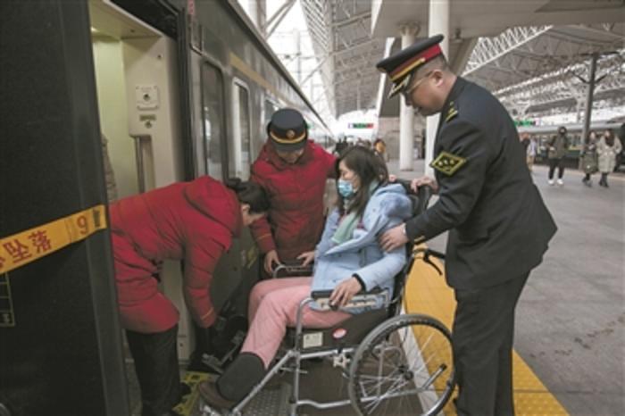 1月1日上午7时40分,北京至合肥的T35次列车到达合肥站,列车长曹杰(右一)及乘务员帮助行动不便的旅客下车。曹亚江 摄