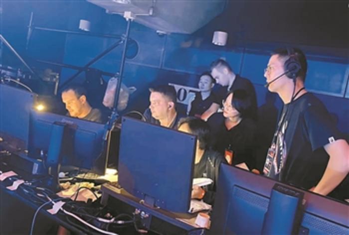 1月1日凌晨,澳门,2020江苏卫视跨年演唱会后台,数控机械导演胡司奇(右一)正在现场调控。吕琳玉 摄