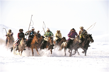 1月6日,演员在乌兰布统草原马文化摄影节上进行骑马表演。