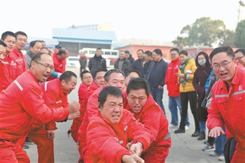2019年12月29日,在河南油田采油二厂井楼采油管理区举行的拔河比赛中,采油运行二班勇夺冠军。“见红旗就扛,有第一就争。”该班班长刘涛自豪地说。 崔洪武 摄