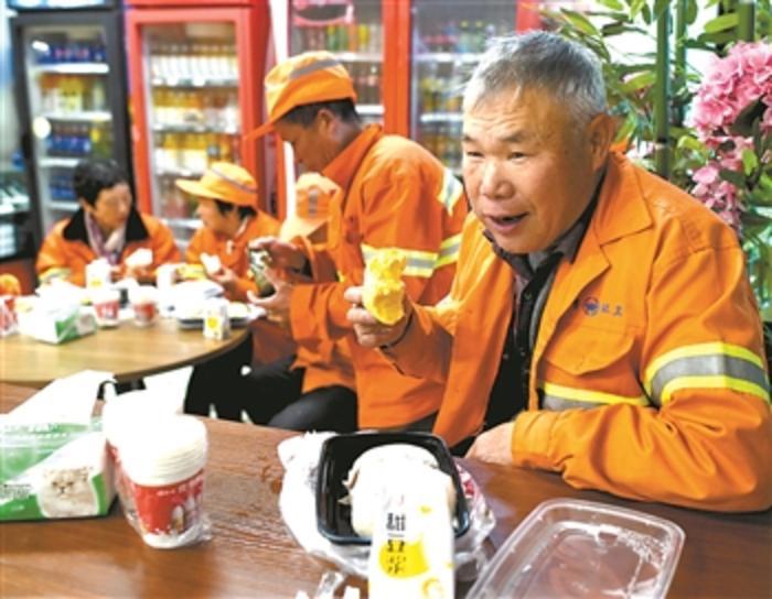 1月7日,环卫工人在爱心早餐服务点吃“爱心早餐”。