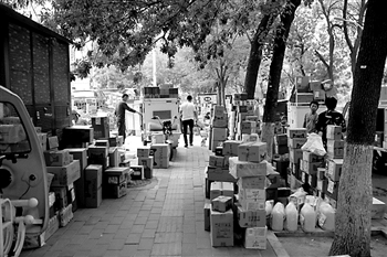 上图,北京安外大街一路口,一家三口骑着摩托车在机动车行车道上为汽车“开道”。下图,北京安德路,快递公司的包裹堆在路口等待分拣,偌大的人行道被占去大半。