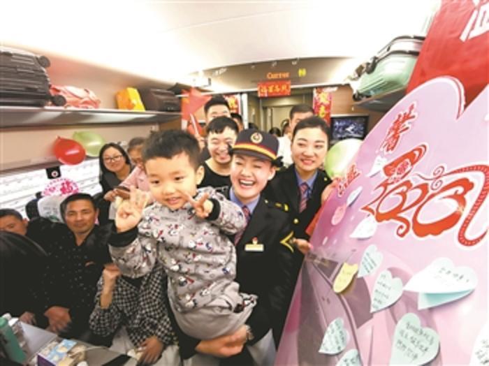 图为在G632次专列的5号车厢里,列车长高学妮带着多才多艺的列车员与农民工互动演出精彩的节目。