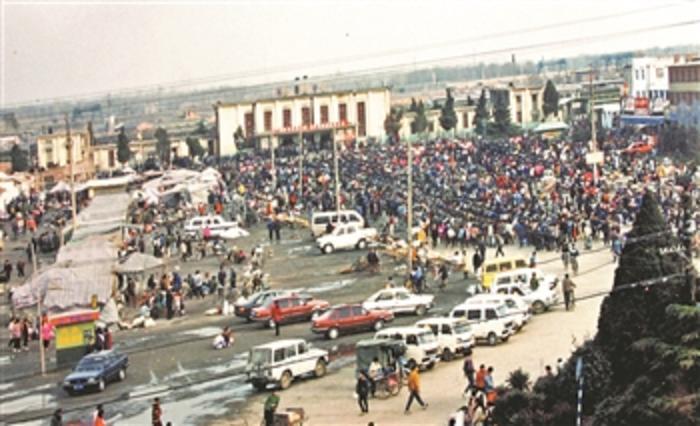 20世纪90年代,阜阳外出务工人员在火车站前排队进站。陆应果 摄