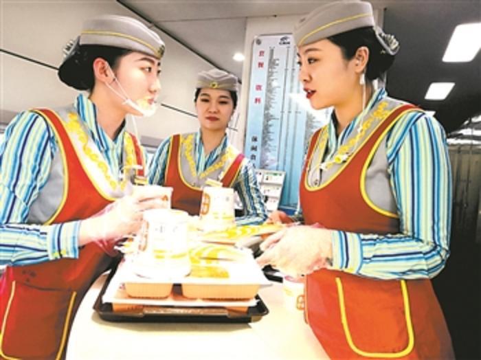 春运中,担当着188对图定、64对临客任务的郑州客运段注重加强对列车食品的安全监督检查,尤其要求高铁列车盯住预包装食品的存放与销售。餐车服务人员在销售过程中要做到及时发现涨袋、破损、变形的食品,并一律不准出售。图为1月14日,G805次列车餐车长与同事交流食品安全问题。本报通讯员 陈有会 摄