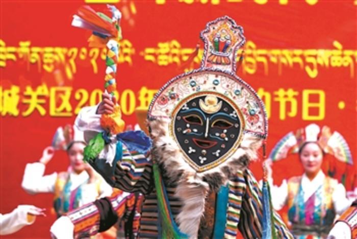 1月15日,拉萨市城关区娘热乡民间艺术团在德瑟大院里表演藏戏。