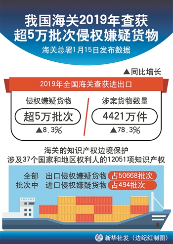 我国海关2019年查获超5万批次侵权嫌疑货物