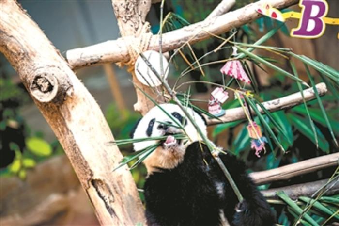 1月14日,在马来西亚吉隆坡附近的马来西亚国家动物园,大熊猫宝宝“谊谊”品尝生日“大餐”。马来西亚国家动物园14日为在马出生的第二只雌性大熊猫宝宝“谊谊”庆祝两周岁生日。新华社记者 朱炜 摄