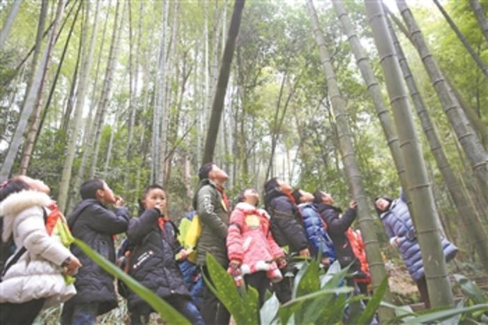 1月16日,在重庆市北碚区缙云山,老师给孩子们讲解楠竹生长知识。