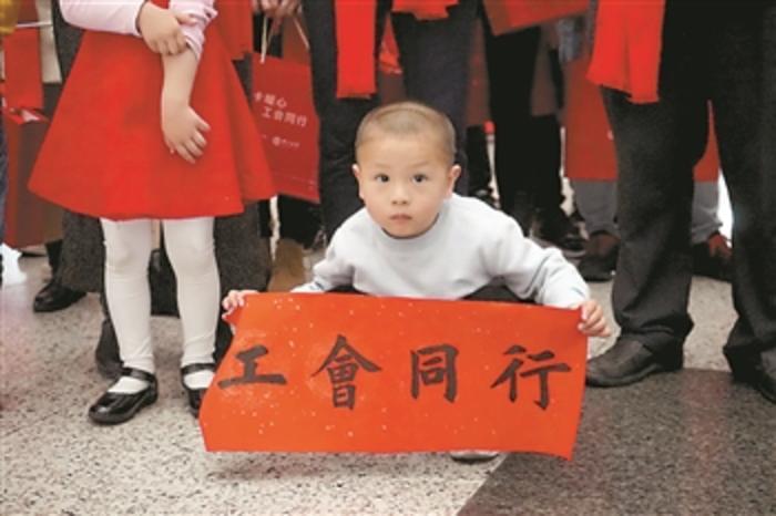1月16日下午,在深圳北站候车室,等待“工会平安返乡号”期间,一个孩子拿着对联让父母拍照。本报记者 刘友婷摄