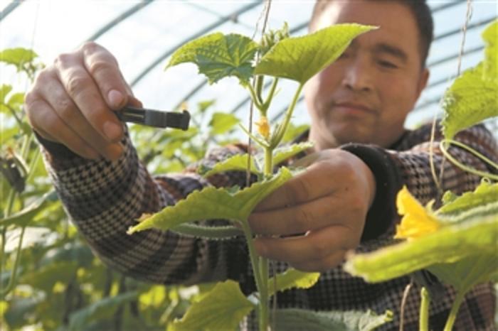 1月9日下午3点,大棚里的温度已经达到35摄氏度,赵玉明正在检查黄瓜秧苗,不一会儿就满头大汗。