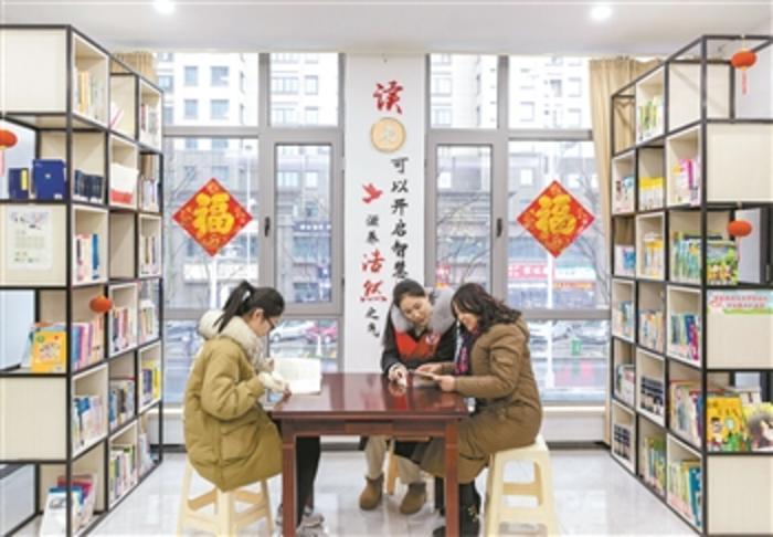 1月16日,江苏海安高新区新陵街道海陵社区农家书屋内,社区志愿者在与返乡人员进行阅读交流。新陵街道海陵社区针对春节前后外出务工人员大量返乡,利用农家书屋这一平台,帮助返乡人员寻找招聘信息、提高法律知识、增强工作技能,让农家书屋成为返乡人员充电、休闲的好去处。 翟慧勇 摄/人民图片