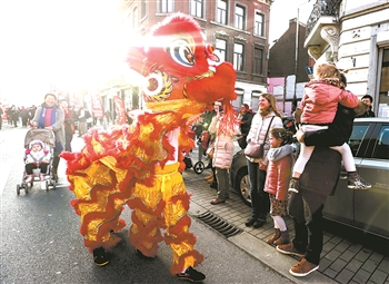 图②:1月18日,在比利时列日,舞狮与观众互动。