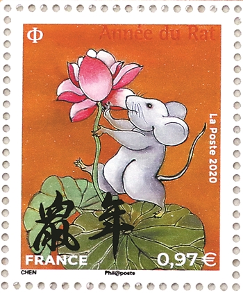 图④:为迎接中国农历新年,法国邮政公司发行两枚中国农历鼠年生肖邮票,图为其中一枚。