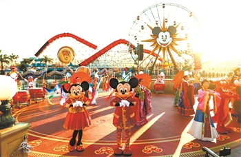图①:1月17日,在美国迪士尼加利福尼亚州冒险乐园,米老鼠米奇和米妮给观众拜年。