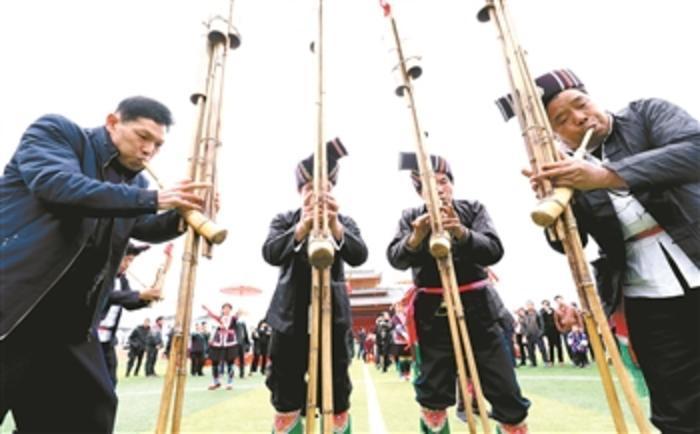 1月20日,在柳州市三江侗族自治县易地扶贫搬迁安置点古宜镇南站社区,搬迁群众在吹芦笙。