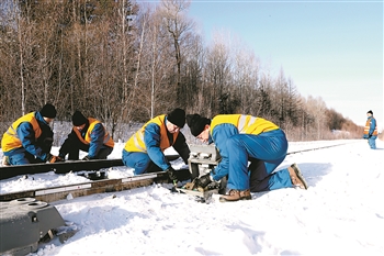 春运期间,吉林车辆段动态监测车间职工需穿越林海雪原,跋涉几百公里,检修红外线探测设备,处理雪堵故障,保证运输大动脉畅通无阻。图为职工正在长白山腹地的荒沟西探测站作业。 刘浩 由跃媛 摄