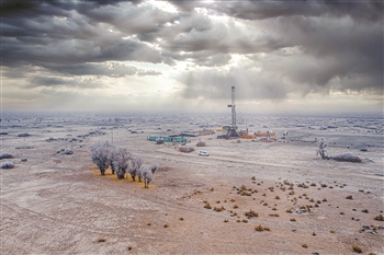 1月8日,新疆塔克拉玛干沙漠呈现美丽的雾凇景观。从空中俯瞰,苍凉的大漠仿佛一个晶莹剔透的童话世界。在位于沙漠北缘的中国石化西北油田采油三厂TK817井,堵水作业正在冰雪严寒中推进,打破了童话世界的宁静,为冬日的沙漠增添了生机和活力。