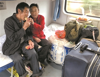赵运玉把糕点送到崔仕清嘴边,过道上摆满了他们的行李。常荣 摄