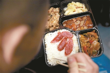 “开饭啰!”送饭车轮子滚动的声音打断了大伙儿“算账”的事,张宁川带着一队身穿蓝色马甲的职工志愿者,从餐车同时向列车两边出发,开始发放午餐。炝炒莴笋、回锅肉、腊肠……从早上8点起,车上的大师傅们就为这些川味川菜忙活了起来。“天下还真有免费的午餐了!”接过餐盒,不少工友都开起了玩笑。