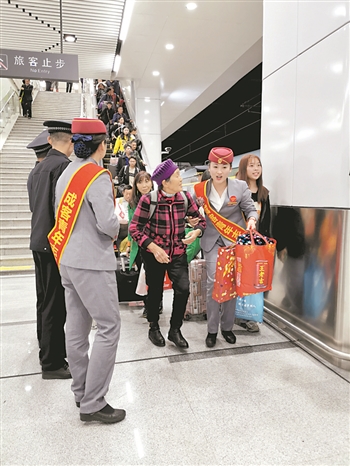 成都客运段青年志愿者协助返乡专列乘客登车。本报记者 李娜 摄