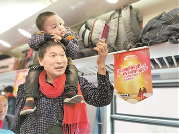 杜镇文把孙子小杰扛在肩上观看列车上的文艺表演。本报记者 李娜 摄