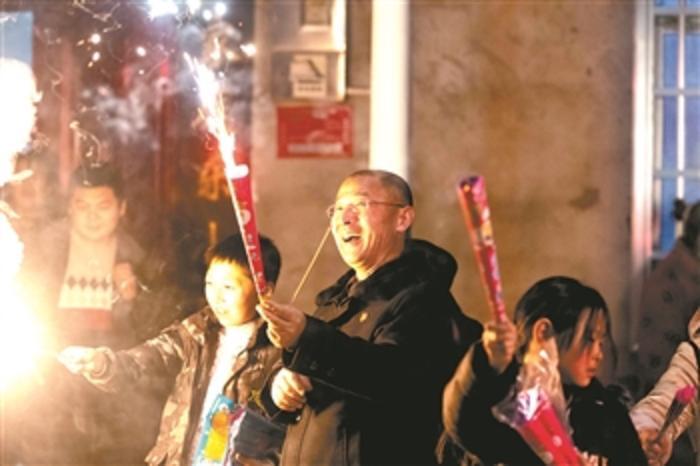 1月21日,在湖南省常德市石门县南北镇金河村,晚饭后扶贫队长张忠富与周边邻居一起放炮竹迎接新年的到来。