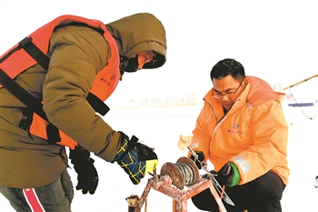 1月20日,头道拐水文站的职工聂宇航(左)和站长沈国庭(右)安装流速仪。
