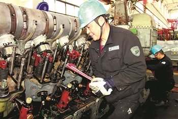 中国铁路上海局集团合肥机务段为满足春运运用机车供给,每天组织技术骨对投入春运的189台客机代客机车进行全面“体检”,确保“火车头”质量良好上线。图为1月21日,该段检修人员正在进行机车柴油机工艺维修。邵品 摄
