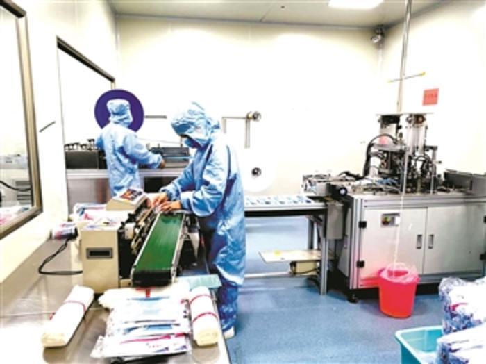 记者在吴熊桂的带领下,经过5道紧闭的大门后,进入口罩生产车间。车间里,多名“全副武装”的操作工正在生产流水线上忙碌。经过多道严格制作工序,一批批医用口罩陆续下线,随即打捆、装箱。