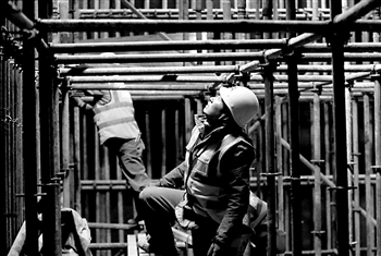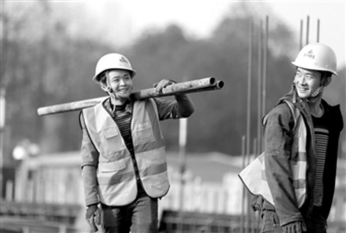 1月16日,建筑工人倪文军(左)扛着铁管准备搭建脚手架。