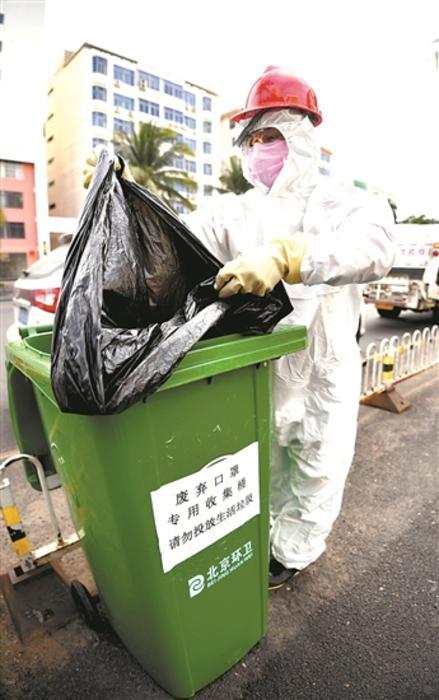 2月2日,陈志勇清理废弃口罩专用收集桶。