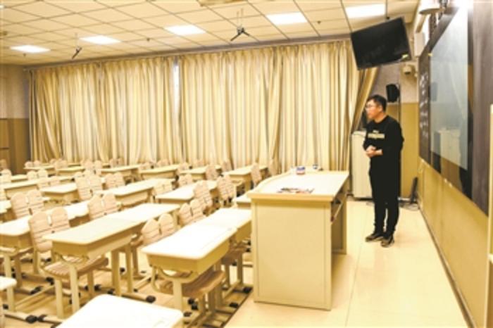 2月3日,在乌鲁木齐市第一中学经济开发区校区,数学老师张伟宝在录制视频课程。
