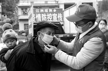 2月3日,在广西河池市凤山县江洲瑶族乡维新村那沙屯,疫情防控志愿队在给未戴口罩的群众戴上口罩。连日来,广西河池市凤山县江洲瑶族乡组织新时代文明实践志愿队,身着红色马甲,开着宣传车,带上宣传资料,进村入屯开展入户宣传、疫情摸排、劝阻聚集、整治经营秩序等疫情防控工作,千方百计切断新型冠状病毒传播途径。周恩革 摄