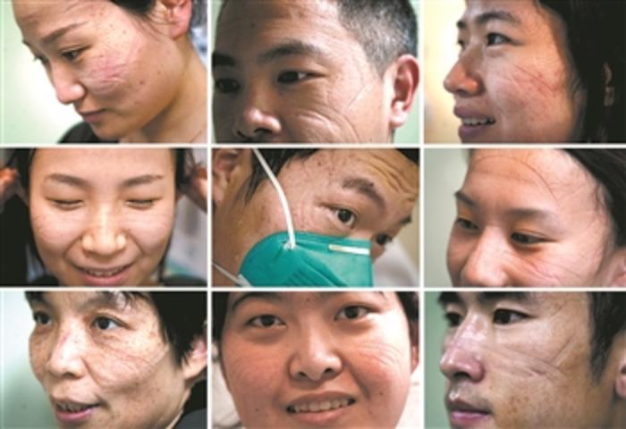 图为南昌大学第一附属医院象湖院区隔离病房重症监护室医护人员脸上被护目镜和口罩压出的印痕(拼版照片)。