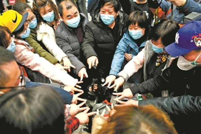 2月9日,在天津滨海国际机场,天津市第五批支援湖北医疗队启程。医疗队员和前来送行的人围成一圈加油打气。