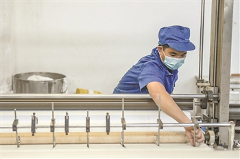 2月6日,海南澄迈欣龙控股公司工人在熔喷无纺布车间裁切生产出的过滤无纺布。为助力抗疫,工厂24小时运转,工人没有休息,保障对口罩原材料的供给。新华社发(蒲晓旭 摄)