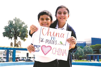 2月7日,在萨尔瓦多首都圣萨尔瓦多,卡斯特利亚诺姐弟展示画作。画上写着:中国,你可以的!萨尔瓦多爱中国。新华社发(亚历山大·佩纳摄)
