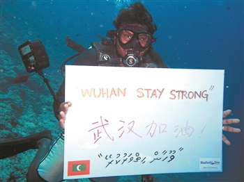2月5日,在马尔代夫马富施岛海域,当地潜水爱好者在水下展示带有“武汉加油”字样的写字板。 新华社发(阿西姆·穆罕默德摄)